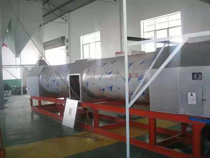 我們解決其技術(shù)問題所采用的技術(shù)方案是:一種新型環(huán)保節(jié)能熱風(fēng)炒爐,由電源供電,包括第一燃燒室、第二燃燒室、熱風(fēng)炒爐滾筒、存料機(jī)、自動(dòng)喂料器、出料機(jī)、引風(fēng)機(jī)和排潮風(fēng)機(jī),所述熱風(fēng)炒爐滾筒的入口端通過自動(dòng)喂料器與所述存料斗連通,所述熱風(fēng)炒爐滾筒的入口端還通過風(fēng)道與所述排潮風(fēng)機(jī)連通,所述熱風(fēng)炒爐滾筒的出口端與出料機(jī)連通,所述第一燃燒室和第二燃燒室通過風(fēng)道與引風(fēng)機(jī)連通,所述第一燃燒室和第二燃燒室分別位于所述熱風(fēng)炒爐滾筒的下方,所述熱風(fēng)炒爐滾筒軸心線與水平面形成2°到8°的夾角,所述第一燃燒器和第二燃燒器安裝位置在相應(yīng)燃燒室的前端或者相應(yīng)燃燒室的兩個(gè)側(cè)面。我們?cè)O(shè)備取消了原熱風(fēng)炒爐所配套的單獨(dú)熱風(fēng)爐、彎段風(fēng)道或直段風(fēng)道;在炒爐滾筒下方設(shè)計(jì)安裝兩份熱風(fēng)燃燒室,用燃燒器產(chǎn)生的熱風(fēng)直接對(duì)滾筒進(jìn)行加熱,******限度地縮減了炒爐散熱環(huán)節(jié)和面積,從而實(shí)現(xiàn)炒爐連段式加熱。與現(xiàn)有設(shè)備相比,我們公司設(shè)備充分利用了熱風(fēng)釋放的熱量,減少了熱量損失,單噸油料或糧食加工消耗添人氣甚至能降低到25nm3,降低了17%,節(jié)能降耗效果非常明顯,得到了客戶的一致好評(píng)。與現(xiàn)有設(shè)備相比,同等日加工量,所配兩臺(tái)燃燒器合計(jì)功率比現(xiàn)有設(shè)備燃燒器功率下降20%-30%,熱風(fēng)設(shè)定溫度有750-800℃下降到400-500℃,明顯延長了炒爐的使用壽命。第一燃燒室和第二燃燒室的功能各不相同,工作溫度也不一致,第一燃燒室和第二燃燒室能夠?qū)崿F(xiàn)分段加熱溫度控制,更加靈活與合理,安全可靠,便于操作與控制。
